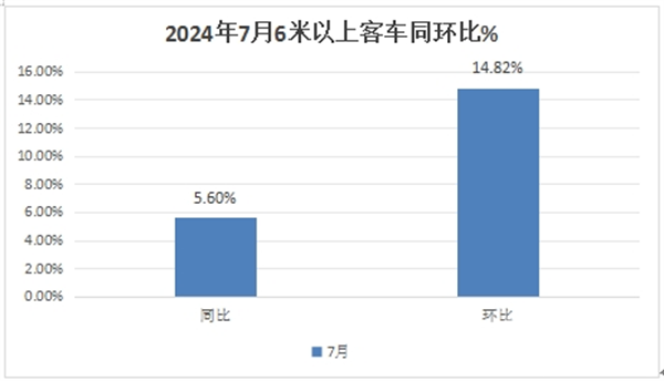 根据中国客车统计信息网数据,2024年8月6米以上客车销量9152辆,同比增长5.6%,环比增长14.82%,呈现了同环比“双增”的良好发展态势。