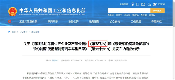 2024年9月13日工信部发布关于《道路机动车辆生产企业及产品公告》(第387批公告,下也称“本批次公告”),这是2024年以来工信部发布的第9批汽车新车产品公告。