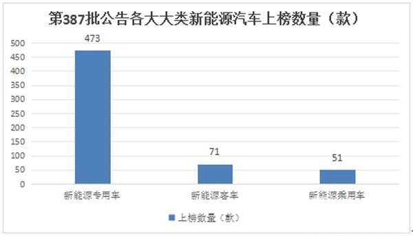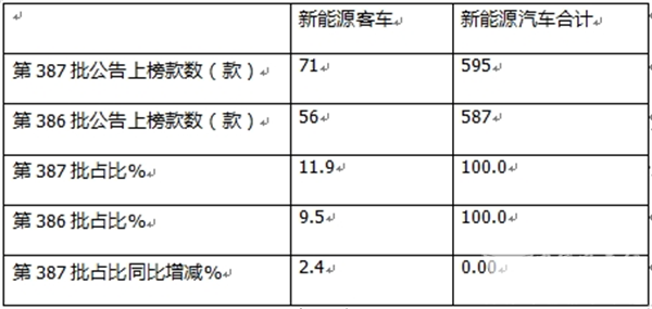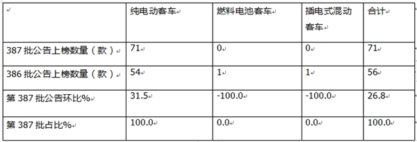 按汽车大类划分,第387批公告中上榜的新能源车型中,包括新能源客车71款,占比11.9%,占比环比增加2.4个百分点。