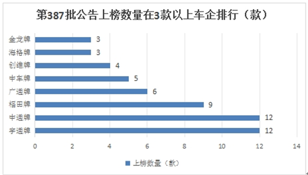 在第387批公告中共有20个客车企业参与了新能源客车新品申报,各个品牌上榜数量统计如下(只统计上榜数量3款机以上品牌企业):