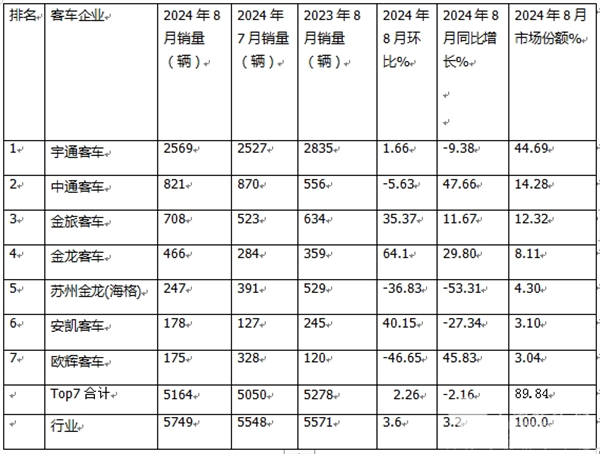 表1,根据中国客车统计信息网数据,2024年8月6米以上传统动力客车销量top7排行(只统计销量在150辆以上车企)