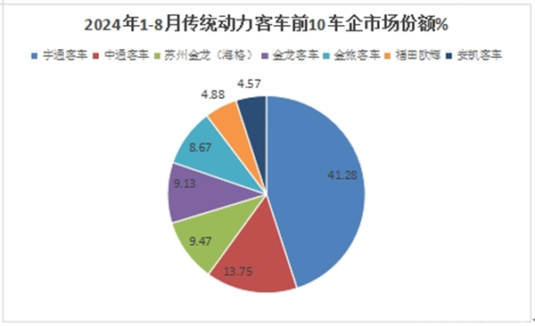上表可见,2024年1-8月大中型传统动力客车销量同比增长36.9%,跑赢2024年1-8月大中客大盘22.85%的增幅近14.05个百分点。说明2024年1-8月大中型传统动力的客车市场成为促进今年1-8月大中型客车市场大盘增长的主要力量。