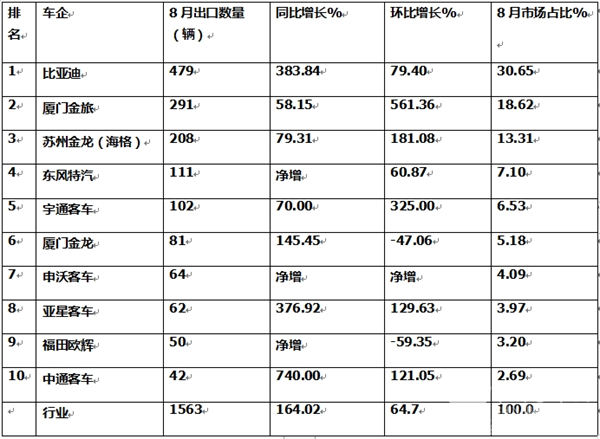 ---比亚迪客车销售479辆,也是唯一出口数量超400辆的车企,以绝对优势位居第一;同比增长383.84%,环比增长79.40%,同环比均跑赢大盘,市场占比30.65%;强势夺冠;可见比亚迪在海外新能源客车出口市场方面,不愧为我国自主品牌的一面旗帜。