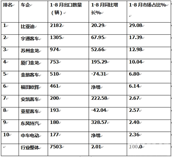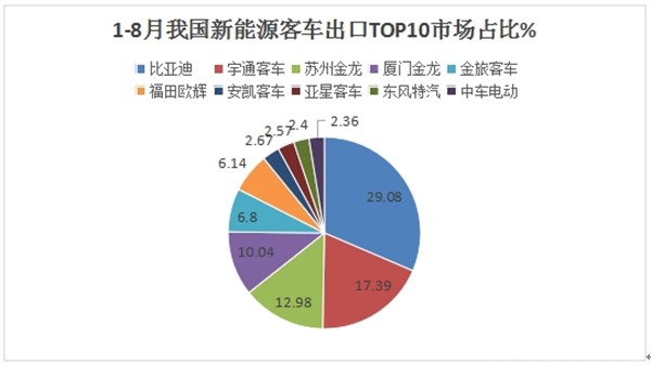 ---上述10家车企中,今年前8月新能源客车累计出口数量超越500辆的只有5家,说明目前我国新能源客车出口规模仍然不大。具体原因上文已经简析。
