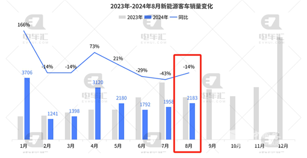 根据终端上牌数据,2024年8月新能源客车销售2183辆,环比增长11%,同比下降14%。