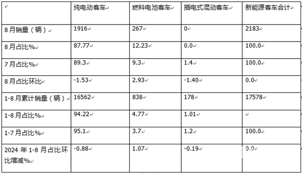 表1,根据终端上牌数据,按技术路线划分,2024年8月及1-8月各类新能源客车终端销量占比及占比环比增减: