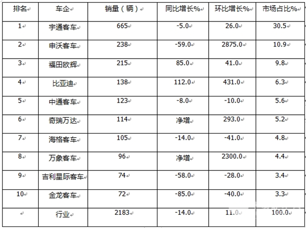 ---宇通客车销售665辆,是唯一销量超过500辆的车企,强势夺冠,同比下降5%,环比增长26%,同环比均跑赢大盘;市场占比30.5%;表现抢眼;反映了宇通客车在新能源客车领域无人能撼动当然老大地位;