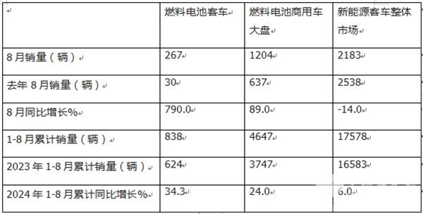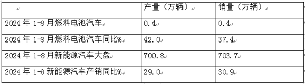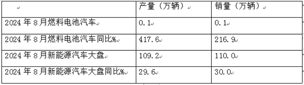 截图1,2024年8月燃料电池汽车产销及同比(数据来源:中汽协)