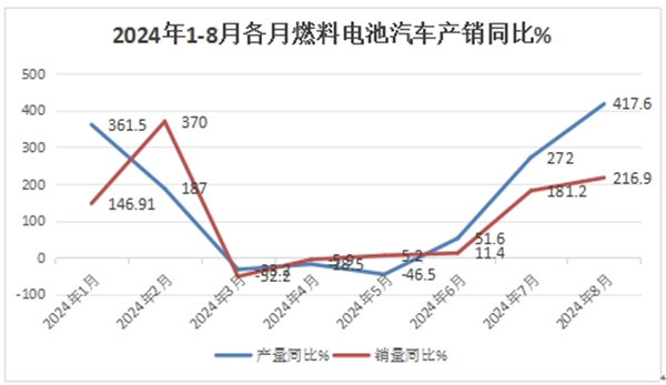 特点一 、2024年8月燃料汽车产销同比分别增长417.6%和216.9%,产销量同比均跑赢今年8月新能源汽车产销大盘