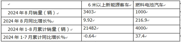--2024年1-8月燃料电池客车终端销售838辆,累计同比增长34.3%,分别跑赢今年1-8月燃料电池商用车大盘终端市场24%的增速和今年1-8月新能源客车终端市场6%的增速;