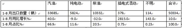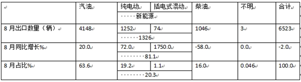 上表显示,按燃料动力种类划分客车出口市场特征,今年8月各细分市场销量特征: