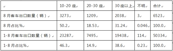 总之,无论是今年8月还是1-8月,10-20座的轻客出口最多,领跑客车出口大盘;而30座以上大型客车出口占比居第二;20-30座的中型客车出口占比最小。