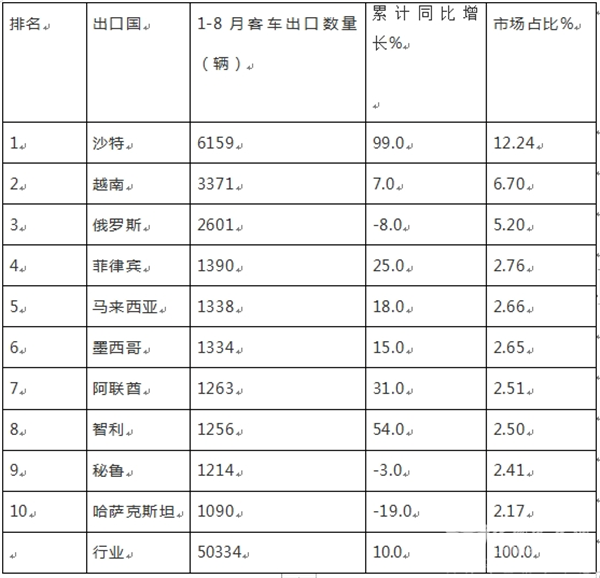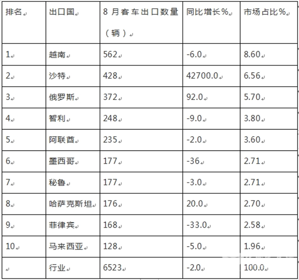 8月客车出口:销6523辆降2%新能源领涨;越南\沙特\俄罗斯居前三