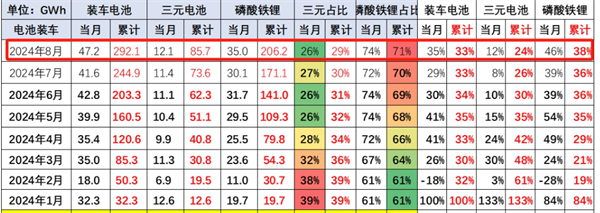 根据中国汽车流通协会提供的数据(见截图1),2024年 8月我国动力电池装机量共计47.2GWh,同比增35%。
