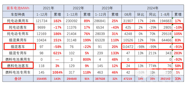 上表可见,在2024年1-8月各类技术路线新能源客车装机量同比中:
