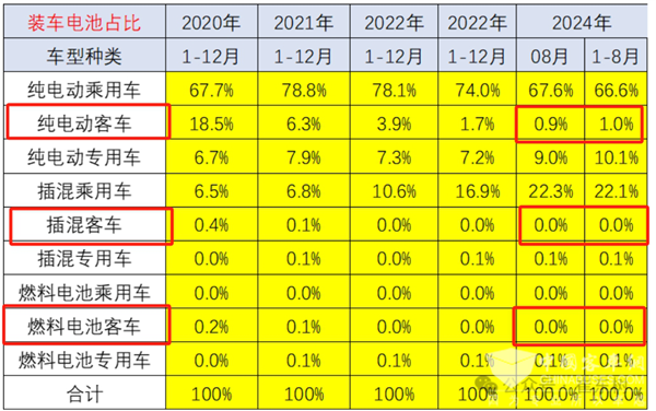 截图3,2024年8月各技术路线新能源客车装车量占新能源汽车大盘份额%(数据来源:中国汽车流通协会)
