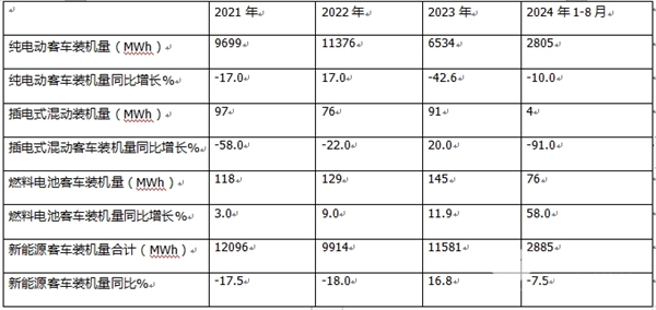 ----2024年1-8月插电式混动客车动力电池装机量居近4年最差,同比领跌