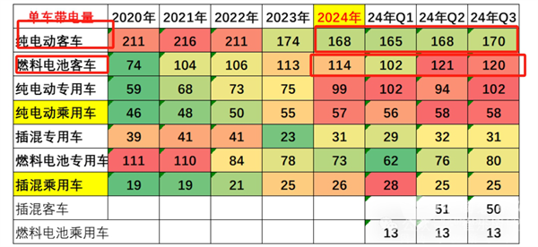 ----2024年1-8月纯电动客车单车平均带电量为:将截图4中2024年3个季度的单车平均带电量相加再除以3即得:(165+168+170)/3=167.7KWh,在近4年中居于最低;说明近年来市场对纯电动客车需求车型“大转小”趋势明显。