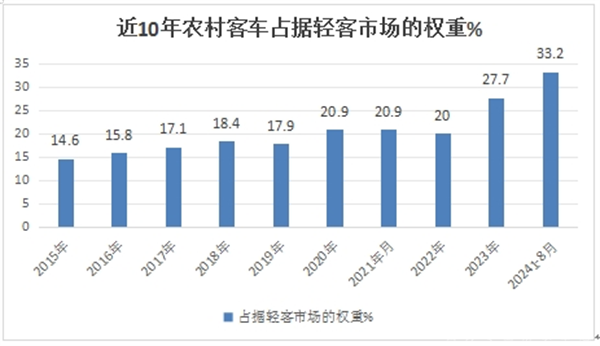 上图表可见,在2024年前8月,农村客车占据轻客市场的比例为33.2%,占比超3成,创近10年新高。这也是今年1-8月农村客车市场一个看点,主要得益于国家支持农村客货邮融合发展政策的大力推动。