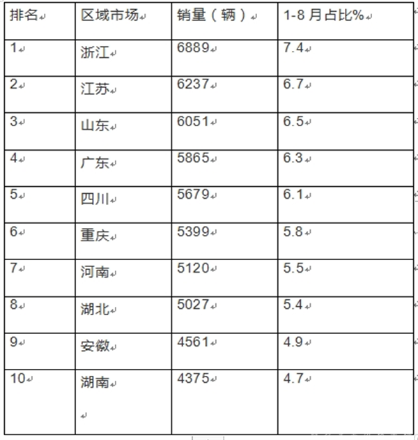 四、1-8月区域流向:浙江、江苏、山东居前三