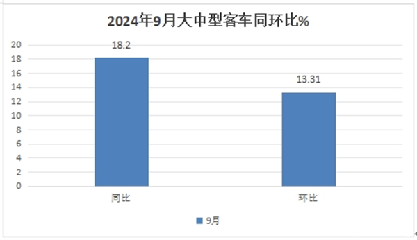根据中国客车统计信息网数据,2024年9月6米以上客车销量10370辆,同比增长18.2%,环比增长13.31%,呈现了同环比“双增”的良好发展态势,这是继今年8月我国大中型客车同环比双增后的再升温。