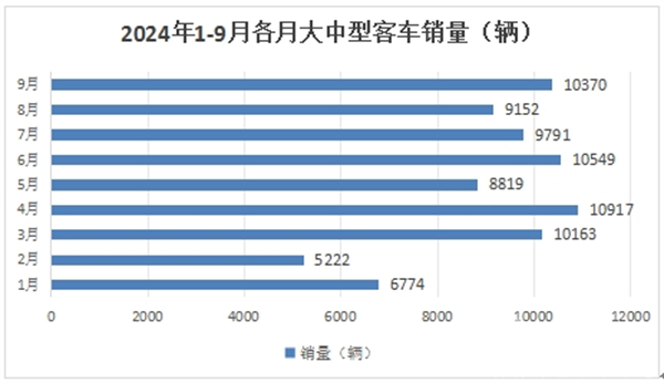 根据中国客车统计信息网数据,2024年1-9月各月6米以上大中型客车销量如下:
