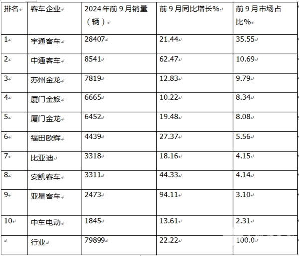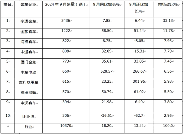 表1,根据中国客车统计信息网数据,2024年9月6米以上客车top10销量排行: