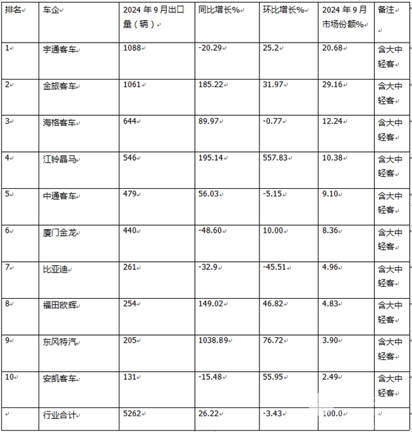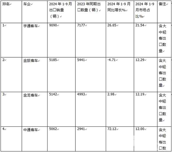 那么2024年9月及1-9月我国客车企业出口排行如何?