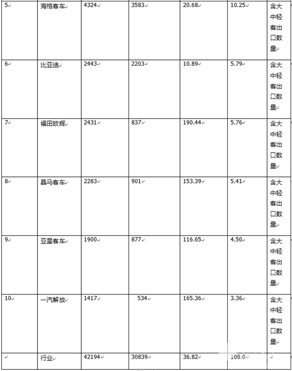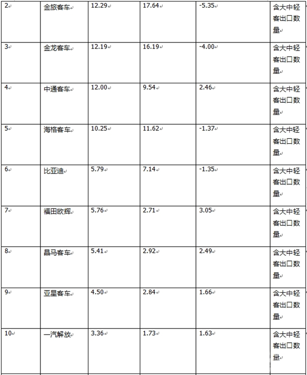 ---海格客车(苏州金龙)累计出口4324辆,同比增长20.68%,跑输大盘,市场占比10.25%,居第五;