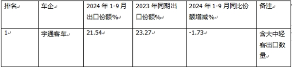 表2,根据中国客车统计信息网数据,2024年1-9月客车企业整体出口TOP10排行(不含轻客出口数量):