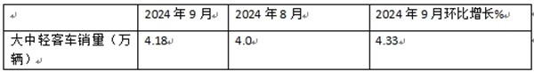---2024年9月大中轻客车环比增长4.33%,据分析主要是今年9月大中型新能源客车销量环比上个月均有较大幅度增长,这主要得益于老旧新能源公交更新补贴政策在今年9月的进一步落地,因此导致今年9月大中轻客车环比8月呈现增长。