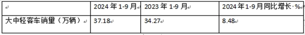1、2024年1-9月大中轻客车累计销37.18万辆,累计同比增长8.48%。