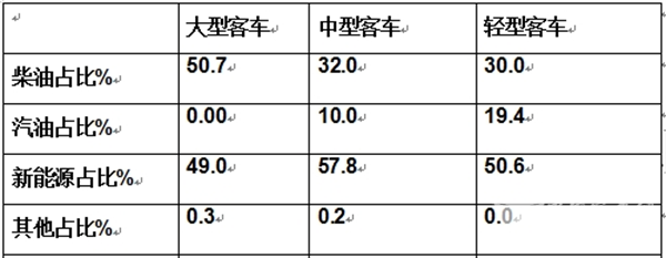 由上表可知,2024年1-9月,柴油在大型客车中占比为最高;汽油类主要是在轻型客车中占比较高,其次是在中型客车中(主要是一些前置的中型商务接待车型,如7米丰田考斯特、宇通T7等);而新能源在中型客车中占比最高。