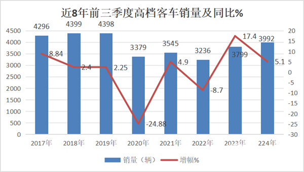 总体看,2024年前三季度90万以上高端客车市场累计销量3992辆,同比小增5.1%,在近8年同期中处于中等水平。