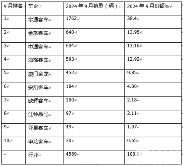一、2024年9月:宇通强势夺冠;“两通三龙”包揽前五