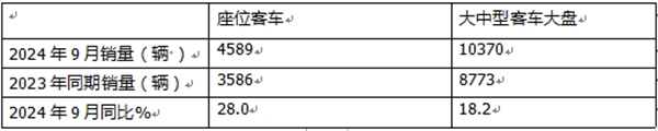 根据中国客车统计信息网数据,2024年9月国内客车企业实现6米以上座位客车4589辆销量(以下数据均含6米以上车型),比去年同期的3586辆增长28%。