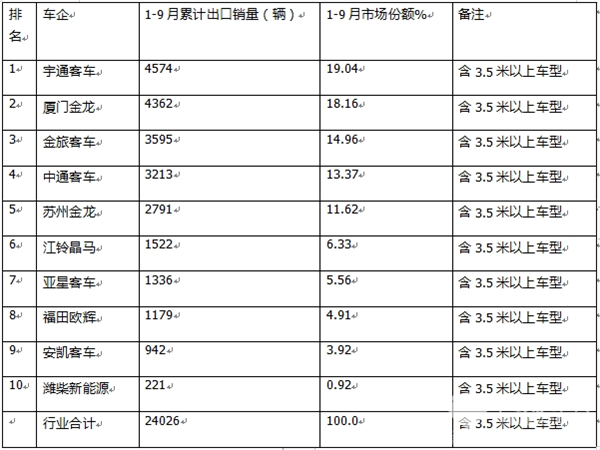 上表显示,在今年1-9月我国座位客车出口市场中,宇通第一,”两通三龙”包揽前五.