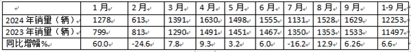 表2,根据终端上牌数据,2024年1-9月各月考斯特客车销量及同比: