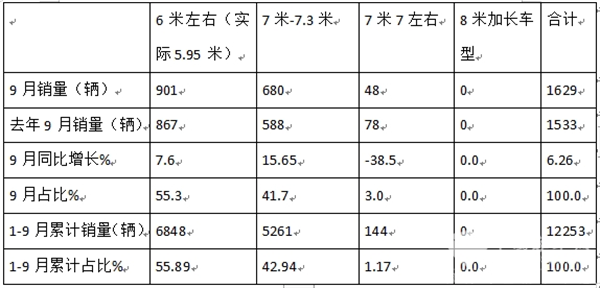 另外,今年1-9月6米考斯特客车累计销售6848辆,累计占比55.89%,也居于主体地位。