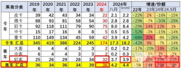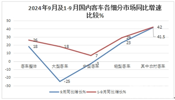 表1,2024年9月及前三季度农村客车与轻客、客车大盘增速比较(数据来源:终端上牌信息)