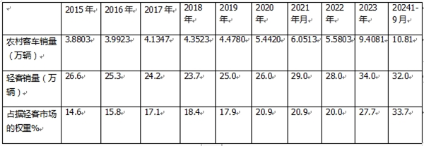 表2,根据终端上牌,2015年---2024年前三季度各年农村客车销量及占据轻客市场的比例统计如下: