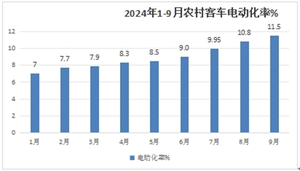 今年9月纯电动客车市场占比为11.5%,也就是说今年9月我国农村客车市场的电动化率达到11.5%。值得一提的是,今年9月的电动化率创下今年以来各月新高。