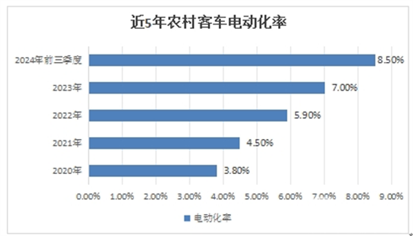 今年前三季度纯电动客车市场占比为8.5%,也就是说今年前三季度我国农村客车市场的电动化率达到8.5%。值得一提的是,今年前三季度我国农村客车的电动化率创下近年新高。