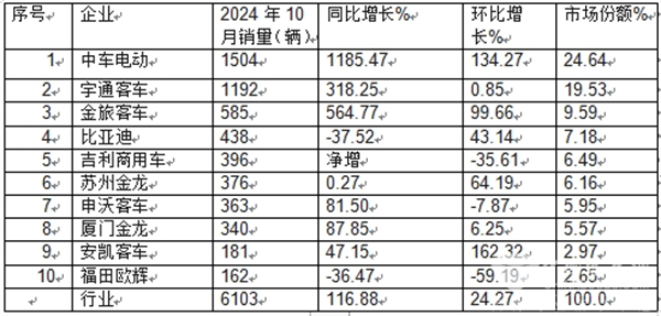 表4:2024年10月新能源客车销量同比与客车大盘比较(数据来源:客车统计信息网):