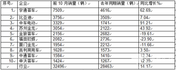 整体看,在今年10月新能源客车竞争格局中,中车首次夺冠,宇通、金旅分列二三;TOP10同比8增2降,中车领涨;环比7增3降,安凯领涨。