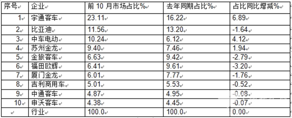 四、1-10月TOP10市场占比同比7增3减,宇通增加最多,表现最抢眼