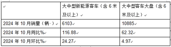 根据中国客车统计信息网数据,2024年10月6米以上大中型新能源客车销6103辆,同比增长116.88%,而2024年10月6米以上大中型客车整体大盘销量10885辆,同比增长62.32%;2024年10月6米以上新能源客车环比增长24.27%,而2024年10月6米以上客车大盘环比增4.97%;也就是说2024年10月6米以上大中型新能源客车同环比均跑赢6米以上大中型客车大盘;