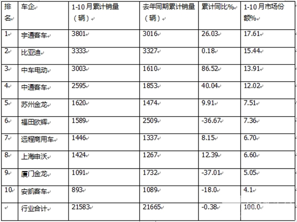 ---1-10月7米以上新能源公交客车累计销售21583辆,同比下降0.38%。可见今年前10月我国大中型新能源公交客车市场表现不够理想。主要原因有: