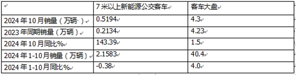 表1:根据中国客车统计信息网数据,2024年10月7米以上新能源客车各细分市场销量及同环比比较: