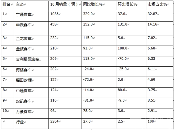 - 10月客车出口:销5105辆 宇通夺冠 “三龙”紧跟 欧辉大涨